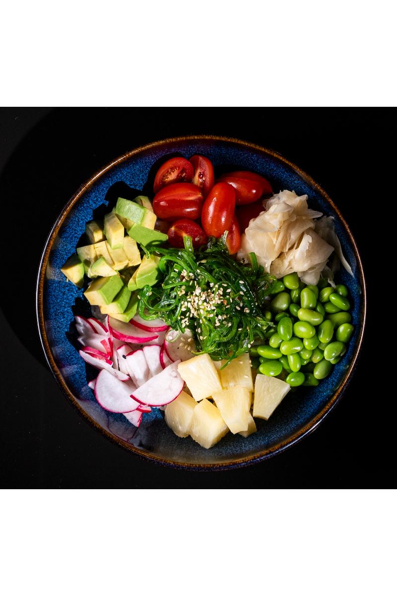 Sjøgress, ris, mango, avokado, soyabønner, reddik, spirer, cherrytomater, sesamfrø, yasai saus. Inneholder: Hvete, sennep, sesamfrø, soya, sulfitt