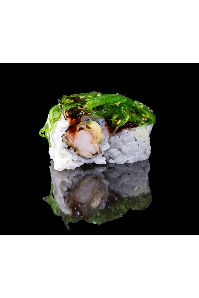 Tempura scampi, avokado, agurk, majones, sjøgress, teriyaki saus. Inneholder: Skalldyr, hvete, egg, soya, sennep, sesam