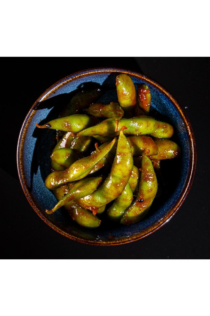 Edamame, kimchi saus. Inneholder: Soya, sennep, hvete