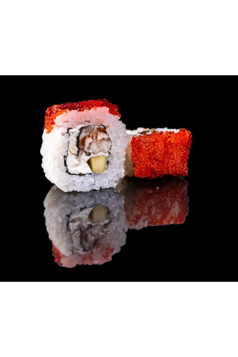Røkt ål, mango, philadelphiaost, flygefiskkaviar, japansk saus. Inneholder: Fisk, melk, hvete, soya, sennep