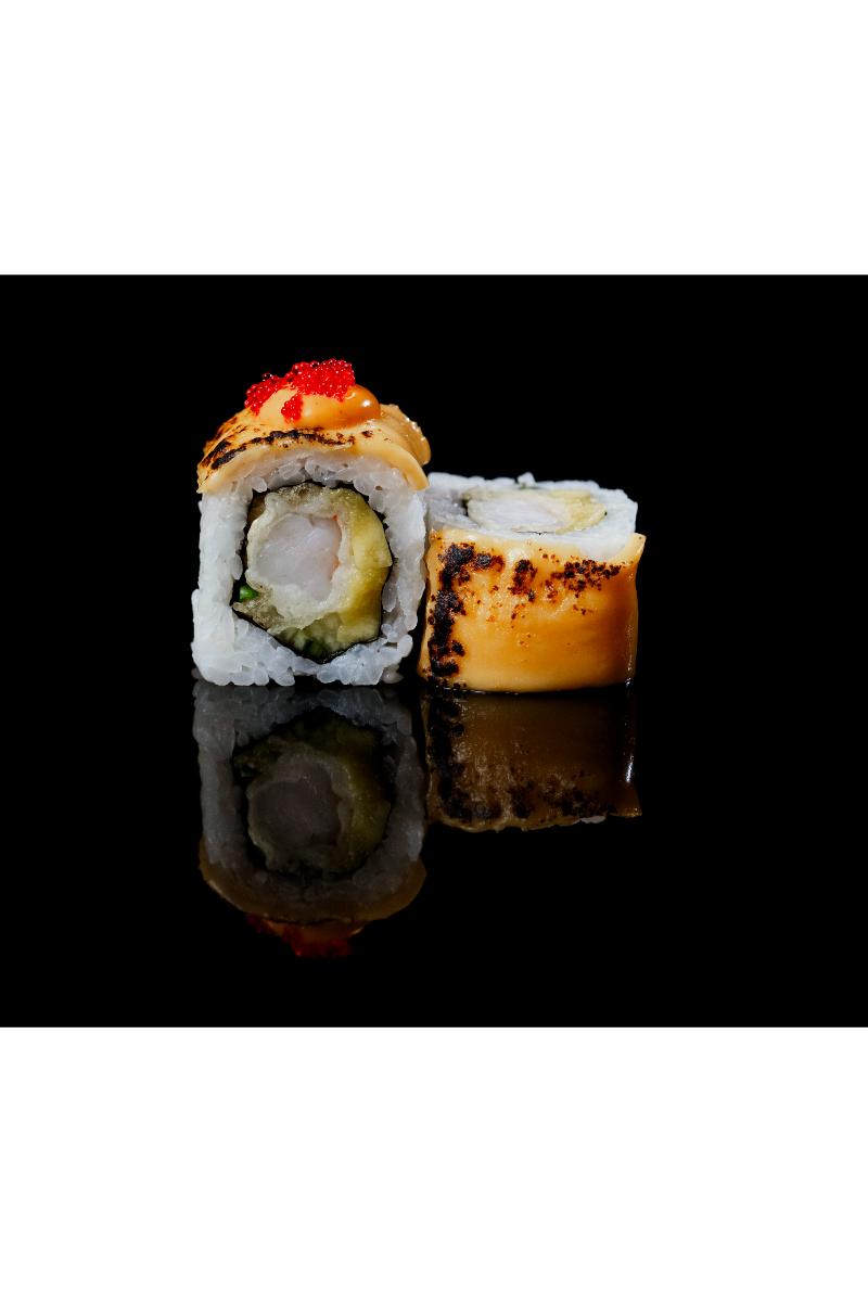 Tempura scampi, agurk, mango, cheddarost, krydret saus, flygefiskkaviar. Inneholder: Skalldyr, soya, hvete, sennep, sesam, melk, egg